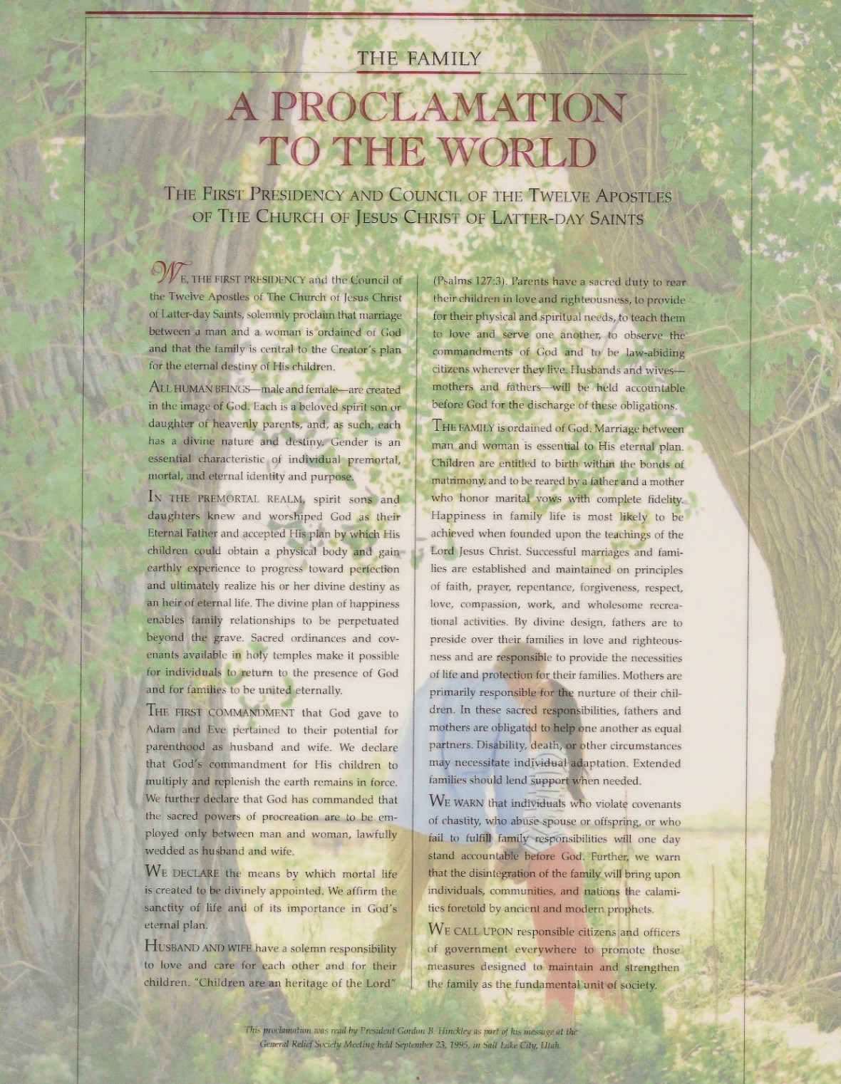 “The family is ordained of God. Marriage between man and woman is essential to His eternal plan. Children are entitled to birth within the bonds of matrimony, and to be reared by a father and a mother who honor marital vows with complete fidelity. Happiness in family life is most likely to be achieved when founded upon the teachings of the Lord Jesus Christ. Successful marriages and families are established and maintained on principles of faith, prayer, repentance, forgiveness, respect, love, compassion, work, and wholesome recreational activities. By divine design, fathers are to preside over their families in love and righteousness and are responsible to provide the necessities of life and protection for their families. Mothers are primarily responsible for the nurture of their children. In these sacred responsibilities, fathers and mothers are obligated to help one another as equal partners. Disability, death, or other circumstances may necessitate individual adaptation. Extended families should lend support when needed.”